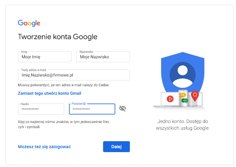 Wejdź na adres https://accounts.google.com/SignUpWithoutGmail który ma domyślną opcję tworzenia konta bez gmail. W miejscu gdzie masz adres e-mail wpisz swój adres firmowy imię.nazwisko@firmowe.pl.
