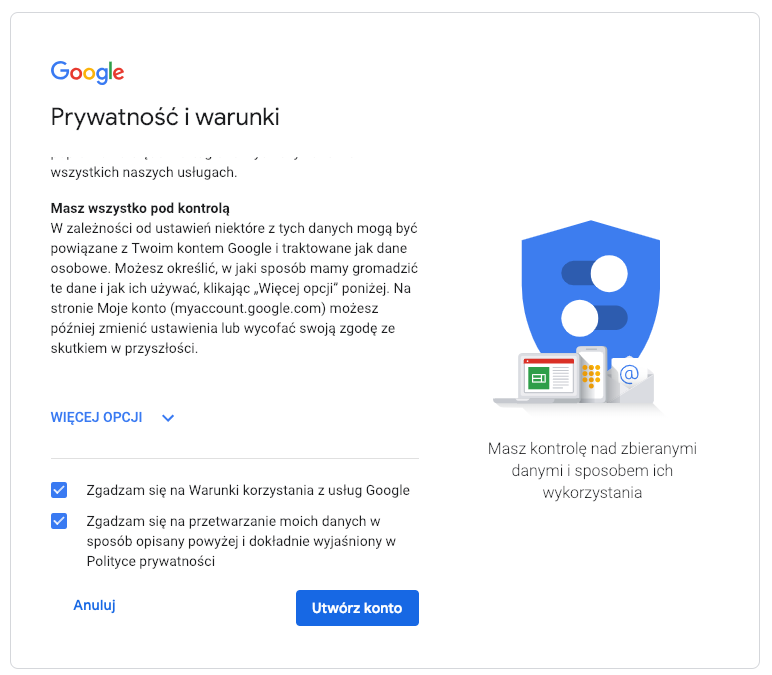 Ostatni ekran to już zgoda na warunki korzystania z usług Google i zgoda na przetwarzanie danych. Po zaznaczeniu obydwu zgód i kliknięciu “Utwórz konto” kończymy proces zakładania konta Google bez gmail :)