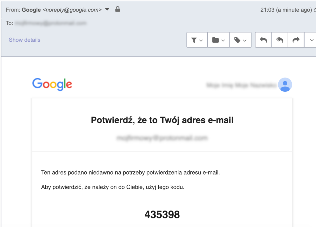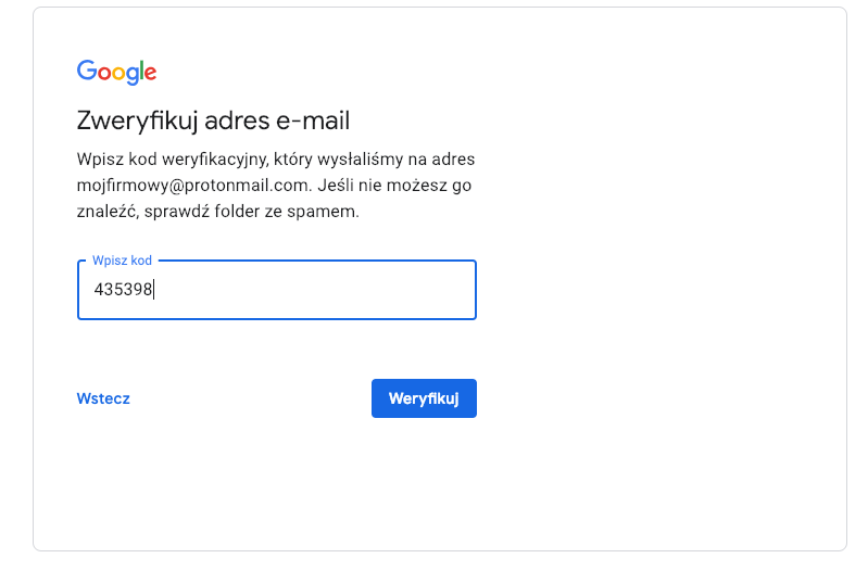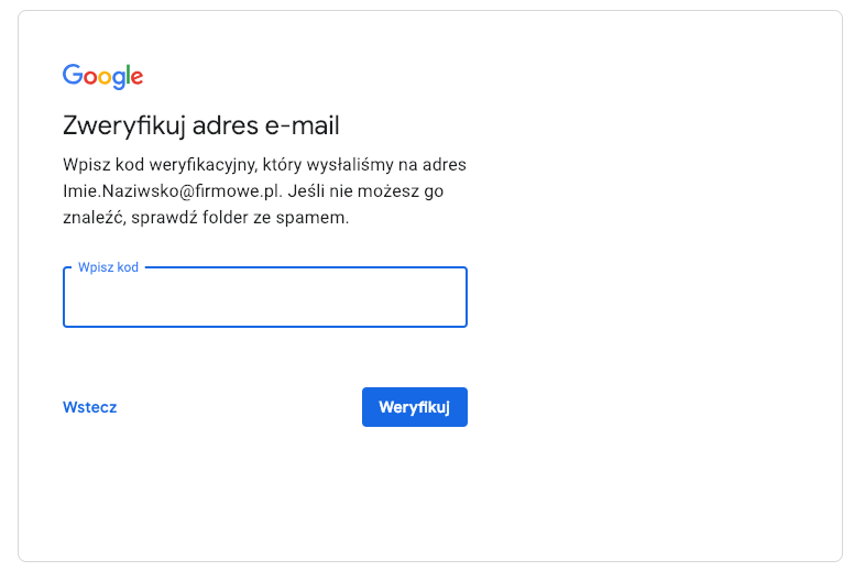 Zaloguj się na swoją pocztę firmową (klient Outlook, przeglądarka lub inna usługa). W mailu od Google o tytule Zweryfikuj adres e-mail znajdziesz kod weryfikacyjny.