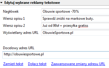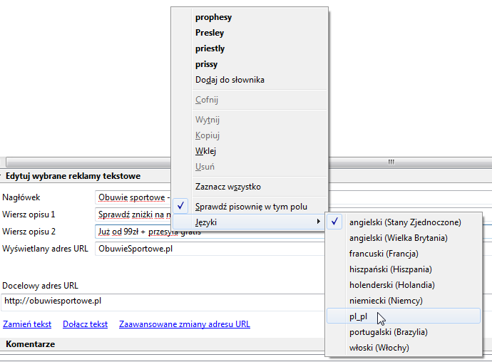 Uruchom Google Ads Editora i zaznacz w polu tekstowym “Sprawdź pisownię w tym polu” i zaznacz polski słownik pl_pl.